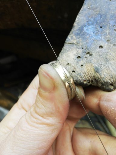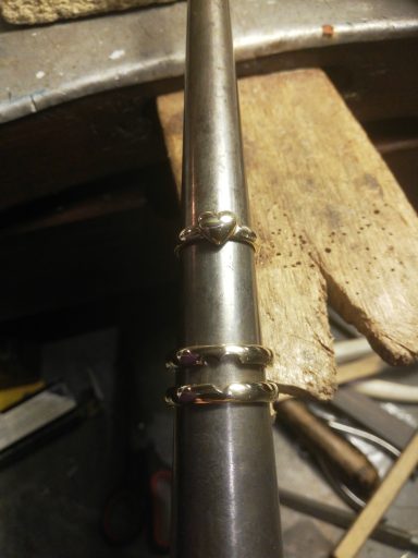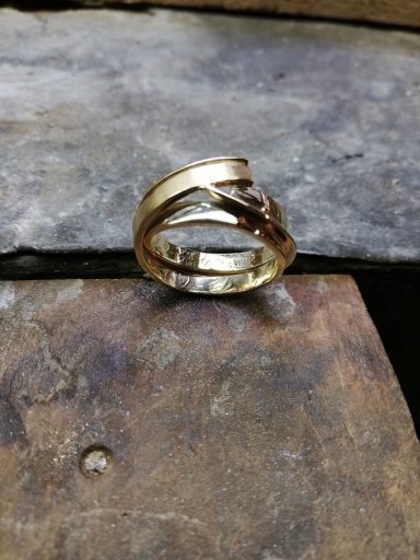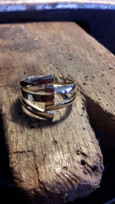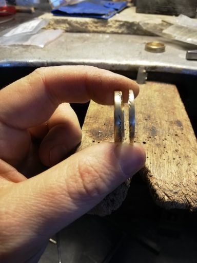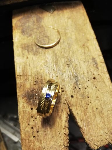 Dit is een mooi voorbeeld om te laten zien dat trouwringen zo veel mogelijk intact kunnen blijven, Een ring heb ik schuin doorgezaagd en over de andere heen geschoven. De bewerking van de ringen is in tact gelaten en door een mooie saffier toe te voegen is de ring helemaal af