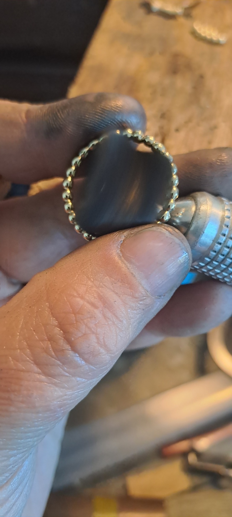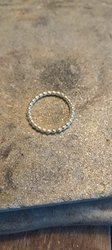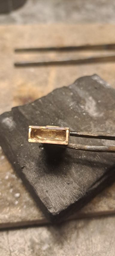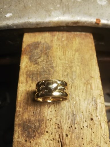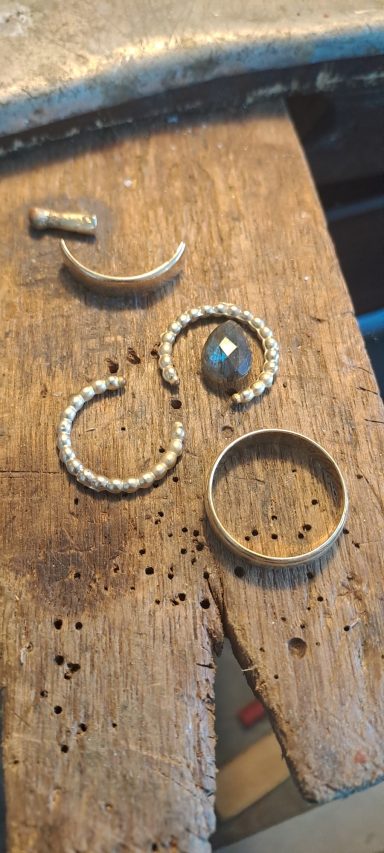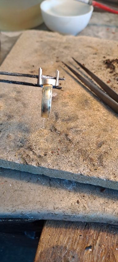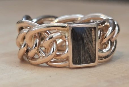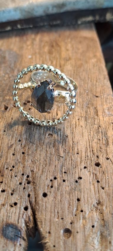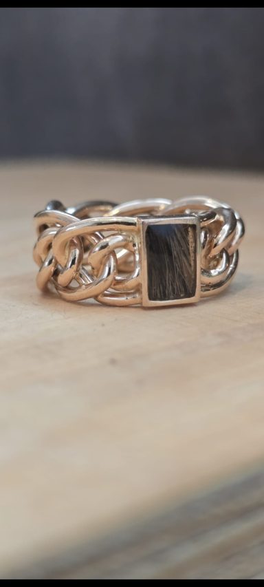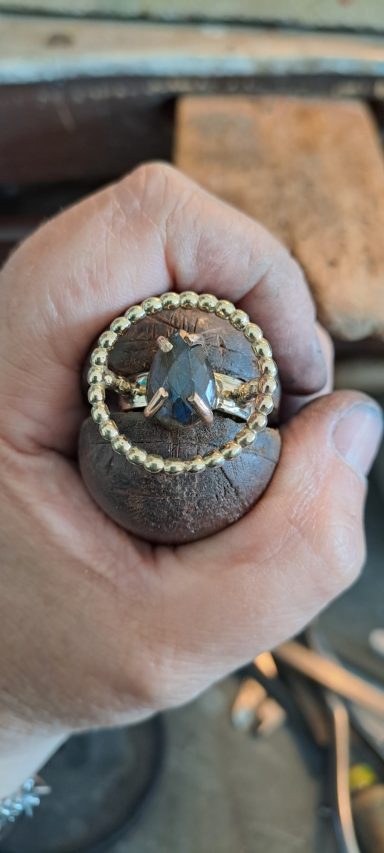 Dit vind ik persoonlijk een heel bijzonder project. Bij deze creatie is de trouwring van de man intact gelaten en daaromheen hebben we samen met de te komen overlijden echtgenoot het ontwerp gemaakt met als belangrijk middelpunt de labradoriet, deze steen beschermt de aura tegen negatieve invloeden uit de omgeving. Het was heel fijn dat hij nog bij dit proces aanwezig kon zijn. De ring wordt met veel liefde en herinnering gedragen, ik hoop altijd dat dit soort werkjes een steun zijn.