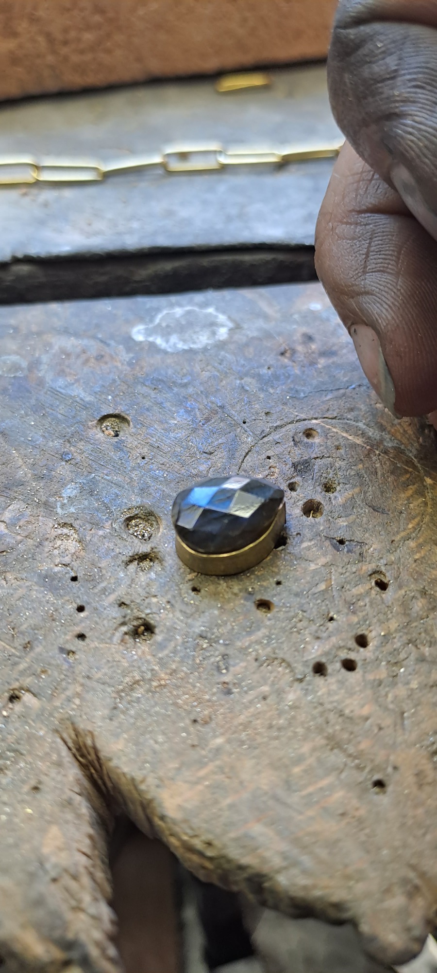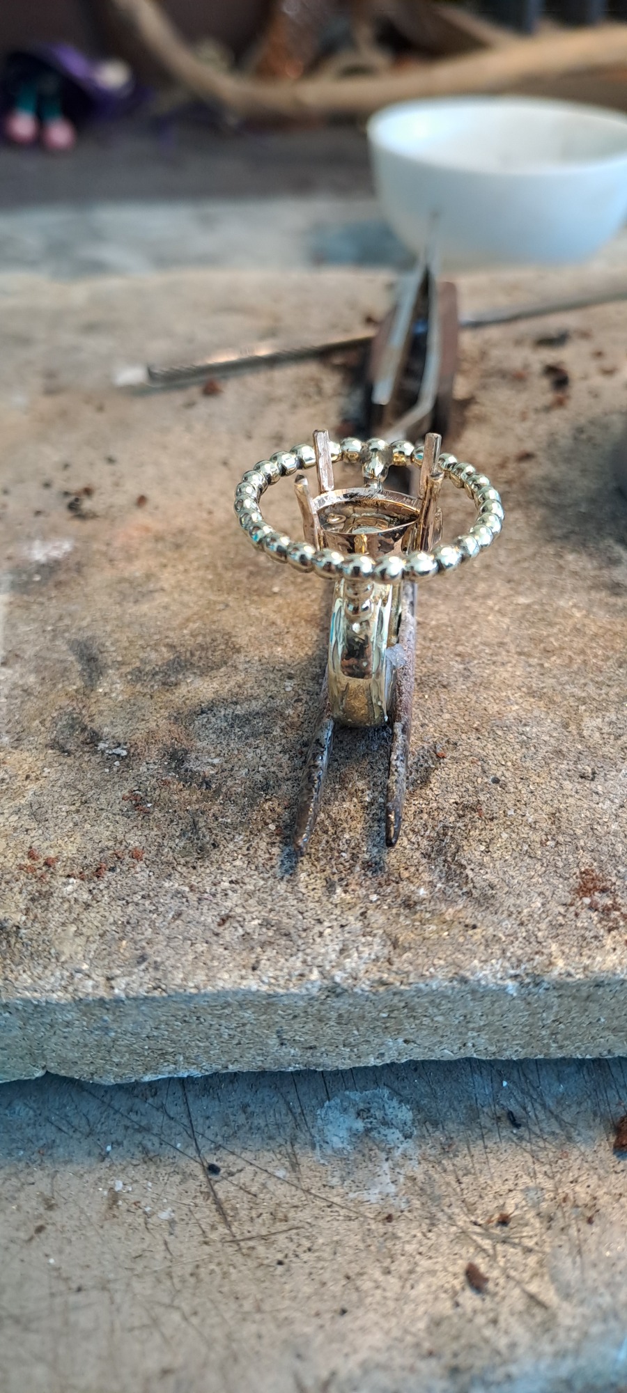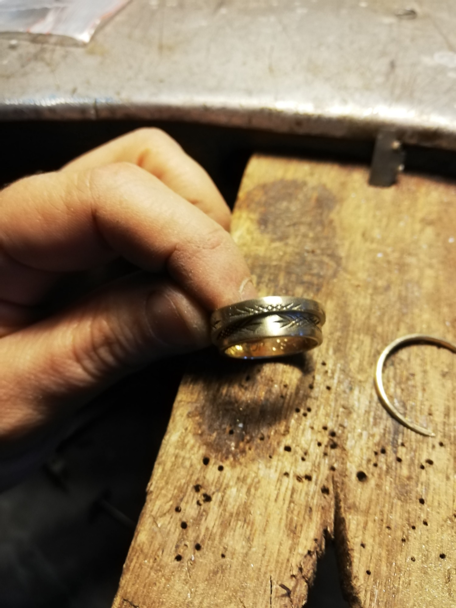 Dit vind ik persoonlijk een heel bijzonder project. Bij deze creatie is de trouwring van de man intact gelaten en daaromheen hebben we samen met de te komen overlijden echtgenoot het ontwerp gemaakt met als belangrijk middelpunt de labradoriet, deze steen beschermt de aura tegen negatieve invloeden uit de omgeving. Het was heel fijn dat hij nog bij dit proces aanwezig kon zijn. De ring wordt met veel liefde en herinnering gedragen, ik hoop altijd dat dit soort werkjes een steun zijn.