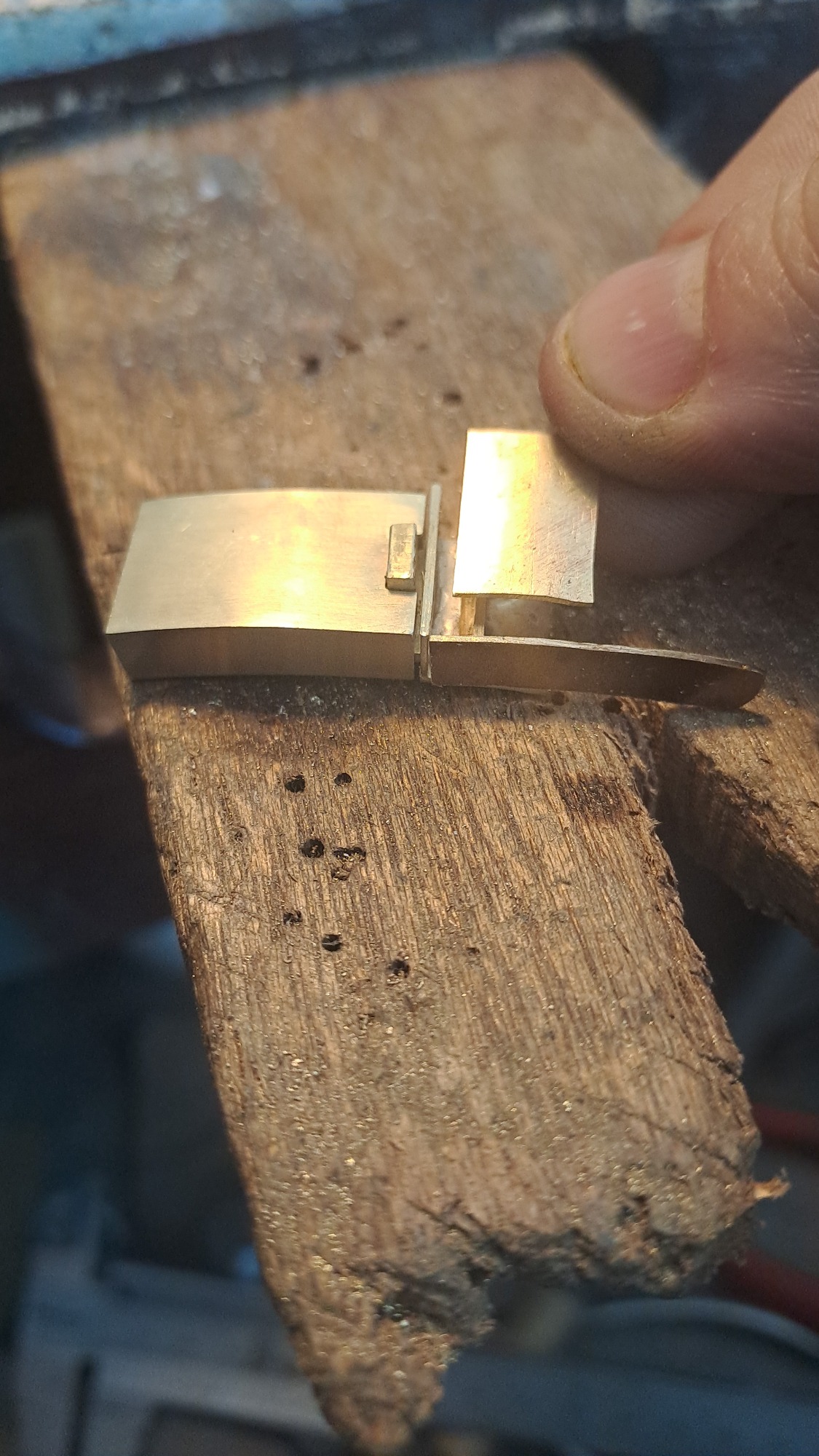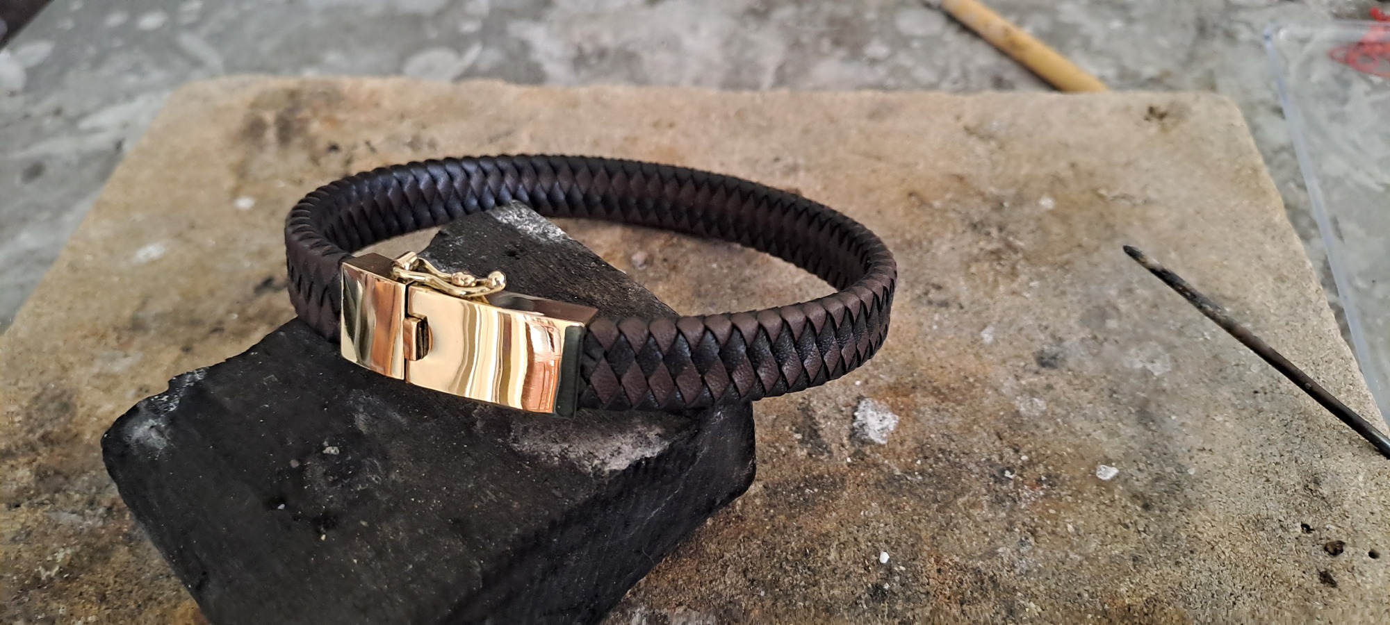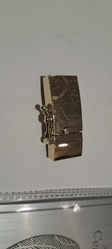 Deze klant kwam bij mij, hij had geen idee wat hij met de ring en het gouden horloge van zijn overleden vader wilde doen. Samen hebben we gesproken over zijn vader en hemzelf en gaande het gesprek kwamen we op een ontwerp wat helemaal passend was voor hem. Het is een prachtig, strak, stevig gouden slot geworden voor een lederen armband. In het slot zit een compartiment waar het as in verwerkt is. De klant is er ontzettend blij mee en draagt de armband dagelijks met heel veel plezier en dierbare herinneringen
